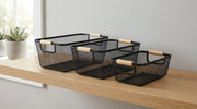 Its sleek matte black mesh and warm wooden accents create a striking, contemporary look that complements industrial, modern, or minimalist interiors. The breathable design keeps contents visible and ventilated, while the rust-resistant powder-coated finish ensures lasting durability. These versatile baskets work as hard as they look good—corralling clutter while adding a refined edge to any room with their bold yet understated appeal.